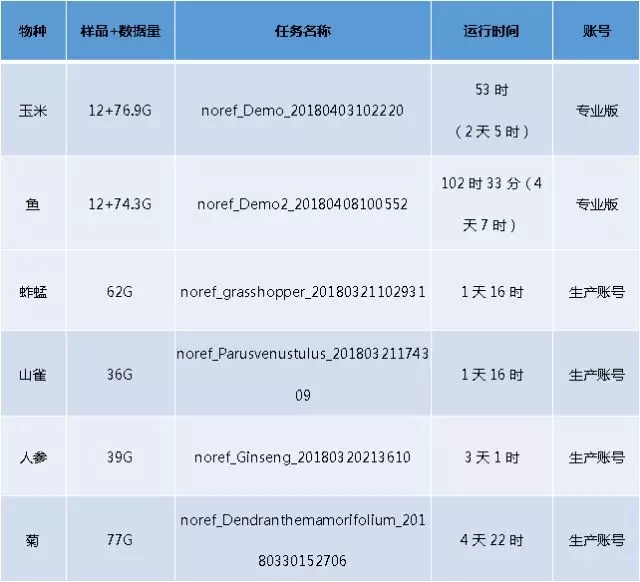 無(wú)參轉(zhuǎn)錄組分析數(shù)據(jù)表明,12個(gè)玉米樣本共76.9G,專業(yè)版賬號(hào)中最快可以在2天5小時(shí)完成交付。而在生產(chǎn)賬號(hào)中,山雀(36G)和蚱蜢(62G)最快可在1天16小時(shí)完成分析。