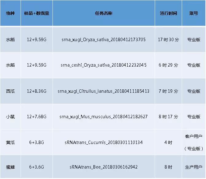 sRNA分析數(shù)據(jù)表明,水稻12個(gè)樣本,共9.59G,在專業(yè)版賬號(hào)中最快可以6小時(shí)29分完成分析。另外,在客戶專業(yè)版賬號(hào)中,6個(gè)黃瓜樣本,共3.8G數(shù)據(jù),最快4小時(shí)完成分析任務(wù)。