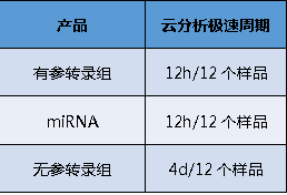 百邁客轉(zhuǎn)錄調(diào)控三大產(chǎn)品有參轉(zhuǎn)錄組、無(wú)參轉(zhuǎn)錄組和miRNA已實(shí)現(xiàn)以下云分析極速周期:
